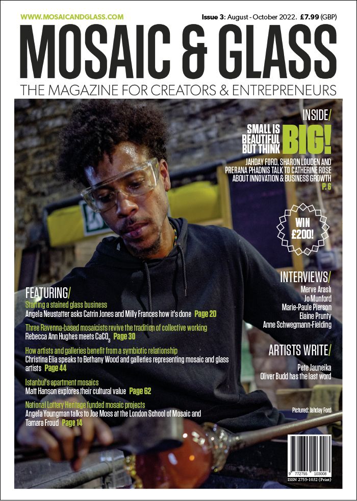 Mosaic and Glass fills a need and gap in an underserved market. It entertains, inspires and educates its readers, who are a mix of hobbyists, side-hustlers and professional artists. Every issue contains interviews, features, technical tips, business advice, opinions and a competition. Its writers are a mix of professional journalists and artists.